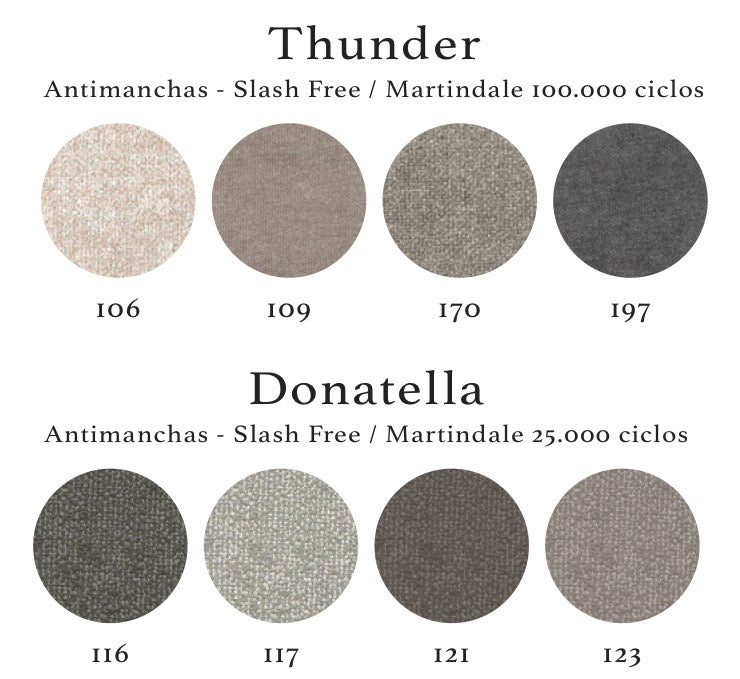 - Tapizado Donatella Thunder:antimanchas, lavable y resistente (hasta 100.000 ciclos Martindale).